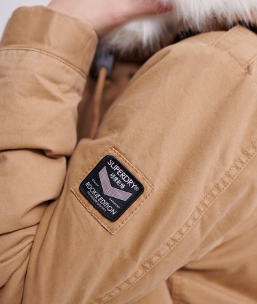 Superdry Falcon Rookie-parkaskåpe for kvinner. Klassisk Rookie-parkaskåpe som har hette med strammesnor og avtagbar fuskepelskant, glidelås- og trykknapplukking, justerbare mansjetter med trykknapper, fald med strammesnor, to forlommer med trykknapper og to parallelle brystlommer. Dekorert med et Superdry-logoemblem på det ene ermet, et Superdry-logomerke på den ene forlommen og epålettdetaljer på skuldrene.