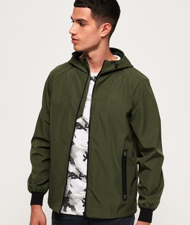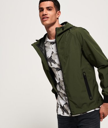 Superdry Echo Beach-regnjakke for menn. Regnjakke i klassisk stil med nettingfôr for bedre pusteegenskaper, glidelåslukking i fronten og elastisk snorjustering i falden. Echo Beach-regnjakken har også ribbestrikk i mansjetter, to forlommer med glidelåslukking og elastisk strammesnor i falden. Regnjakken er dekorert med et gummiert Superdry-logoemblem på ermet.