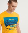 Superdry Vintage Logo-T-skjorte for menn. Et klassisk T-skjorte med rund hals og et teksturert vintage-inspirert trykk over fronten. T-skjorten er uunnværlig i basisgarderoben din og kan kombineres med omtrent hva som helst for et uformelt utseende.